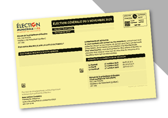 Des outils utiles en ligne | Pour vérifier son inscription sur la liste électorale ou pour connaître les bureaux de vote, les postes en élection et les candidats, il est possible de consulter diverses ressources en ligne, dont le site Web de la Ville de Salaberry-de-Valleyfield au valleyfield.ca/election2025. D’autres plateformes officielles sont également utiles : evoox.ca/salaberry-de-valleyfield/mbv et electionsquebec.qc.ca/voter/verifier-son-inscription-a-la-liste-electorale.