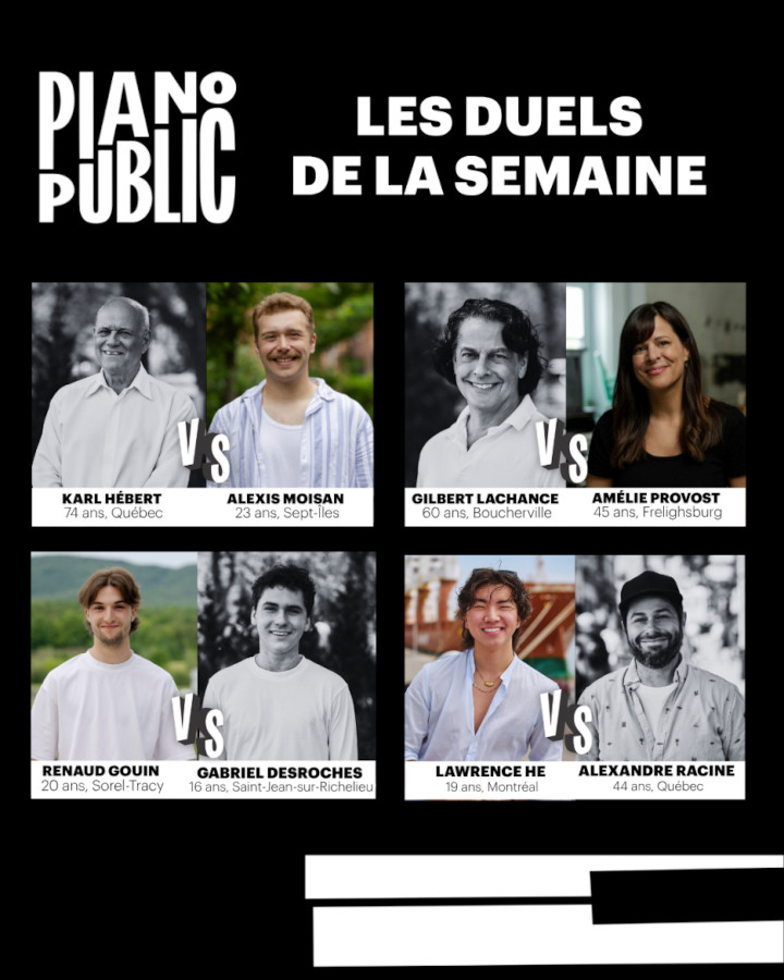 Samedi prochain à Piano public, huit autres finalistes rivaliseront de talent dans des duels surprenants. Lesquels sauront convaincre nos juges et notre juge invité, Louis-Jean Cormier? Les artistes Tom-Éliot et Claudia Bouvette se prêteront aussi au jeu du duel.