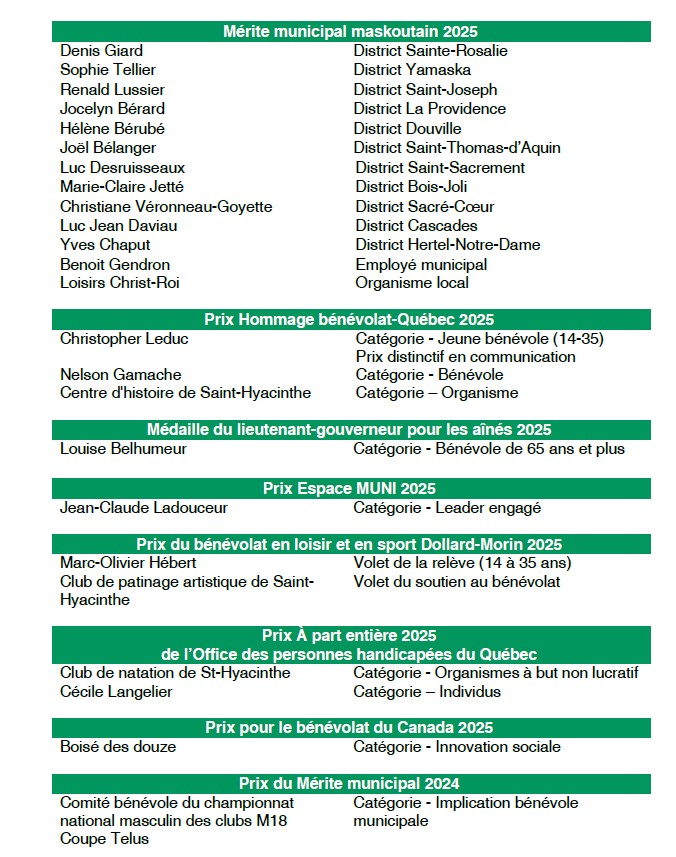 « À Saint-Hyacinthe, année après année, nous constatons à quel point le tissu bénévole est dynamique et précieux. Le nombre et la qualité des gestes posés témoignent d’un engagement remarquable. Ces bénévoles représentent la pointe de l’iceberg du bénévolat maskoutain : des citoyennes et des citoyens qui choisissent d’agir, de participer et de faire une réelle différence dans la vie des autres. Chacun de leurs gestes a des retombées positives évidentes sur la collectivité. Leur implication est importante : elle contribue directement à améliorer la qualité de vie des Maskoutaines et des Maskoutains. Je les en remercie au nom de notre communauté », souligne le maire de Saint- Hyacinthe, André Beauregard.